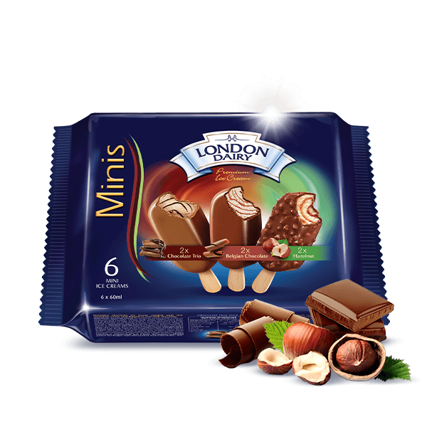 A multipack of assorted mini sticks featuring Chocolate Trio, Hazelnut, and Belgian Chocolate ice cream.