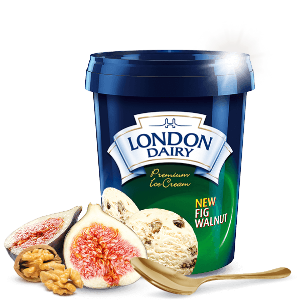 Indulge in the opulence of velvety creamy ice cream adorned with succulent fig pieces and caramelized walnuts