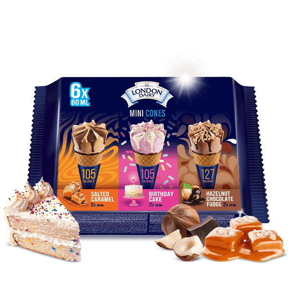 A multipack of assorted low calorie mini cones featuring Salted Caramel, Birthday Cake, and Hazelnut Chocolate Fudge ice cream.